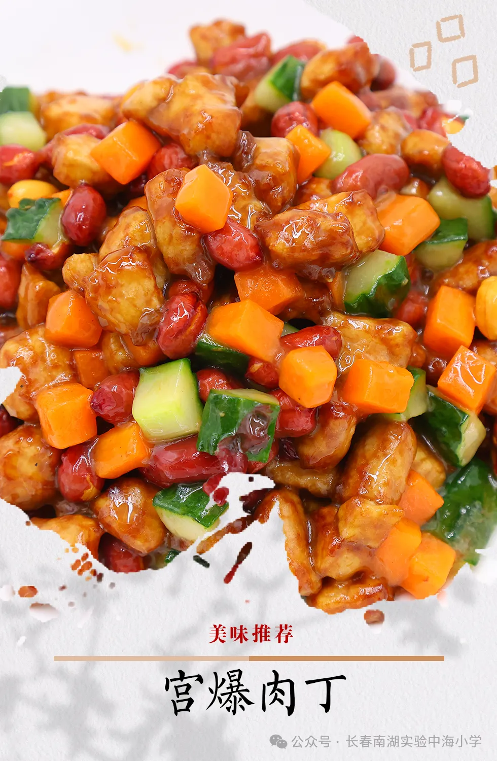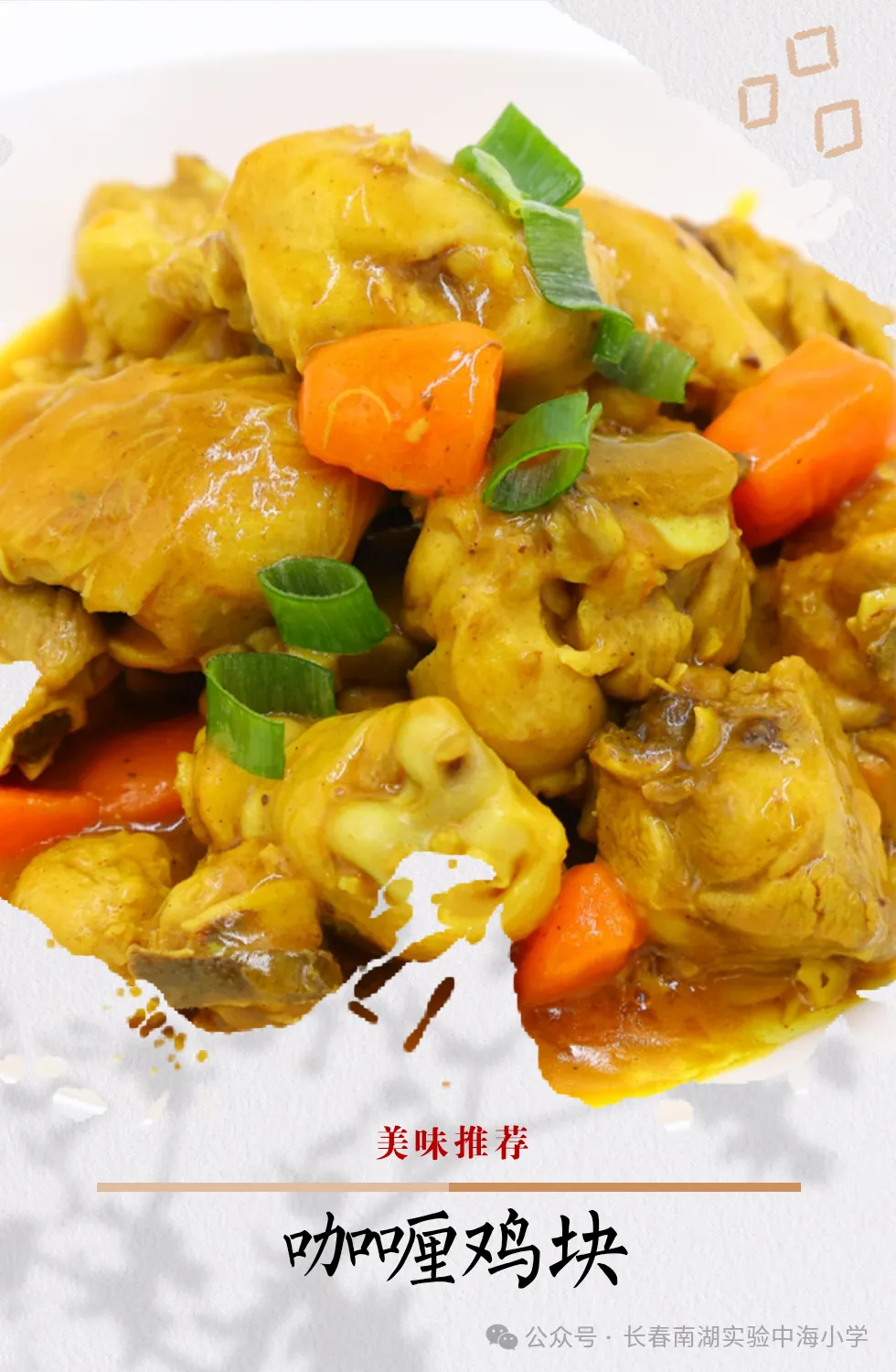 菜谱:咖喱鸡块、宫爆肉丁、芹菜炒粉、蒜蓉罗马生菜、海米萝卜丝汤。
