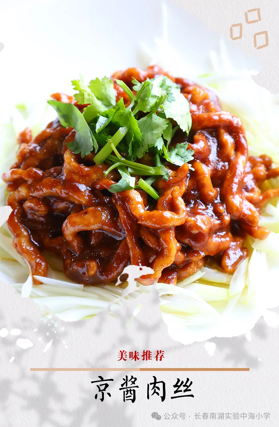 菜谱:京酱肉丝、熘肉段、肉末鱼香西葫芦、海米鸡蛋糕、番茄牛肉汤。