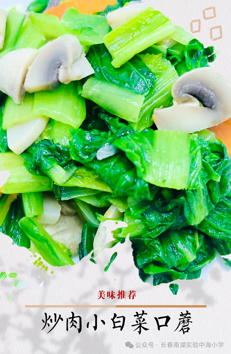 肉炒口蘑小白菜:猪肉10克、口蘑30克、小白菜20克;