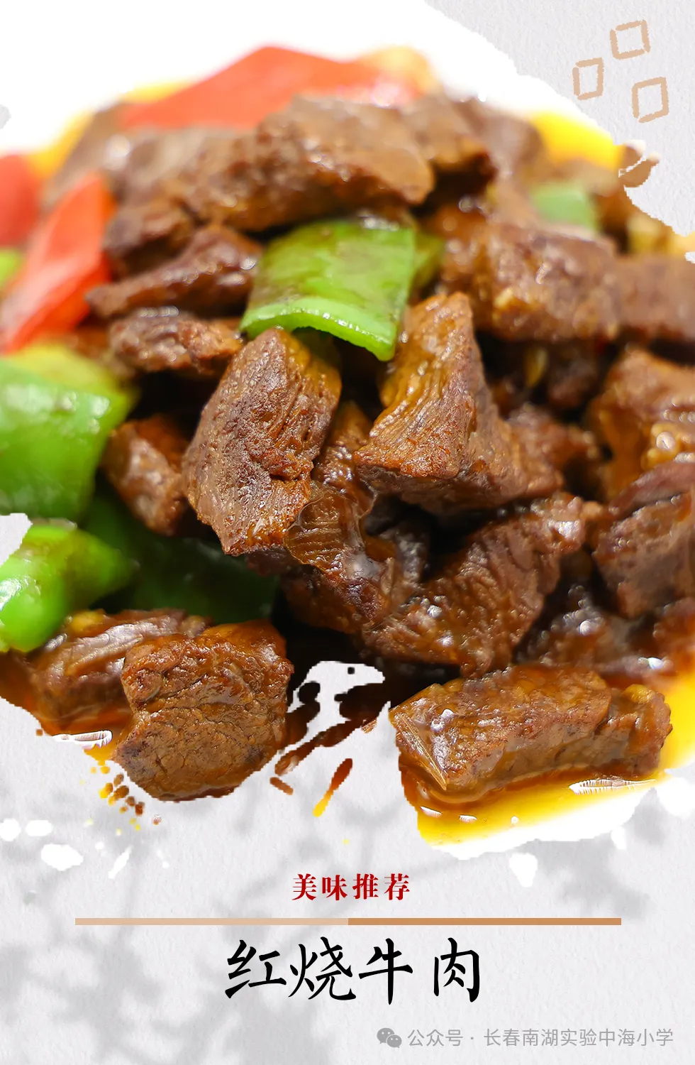 菜谱:红烧牛肉、木须肉、肉炒尖椒干豆腐、蒜蓉粉丝蒸白菜、紫菜虾皮蛋花汤。