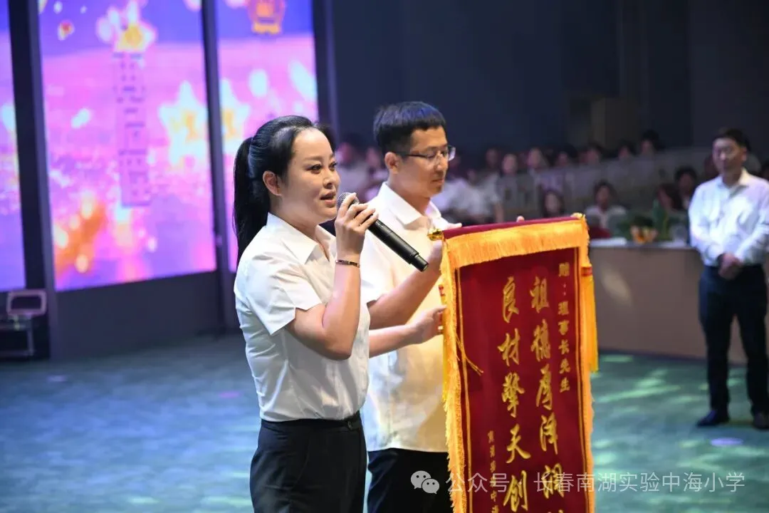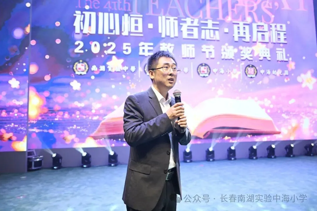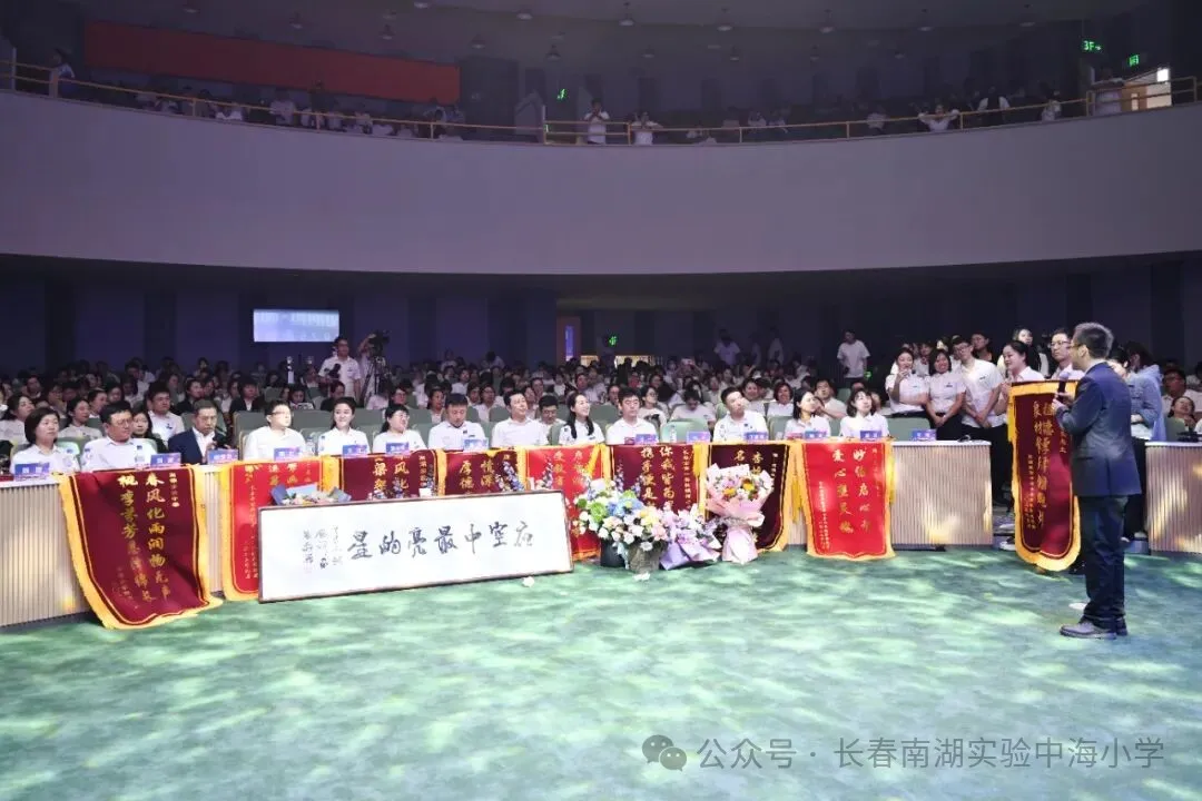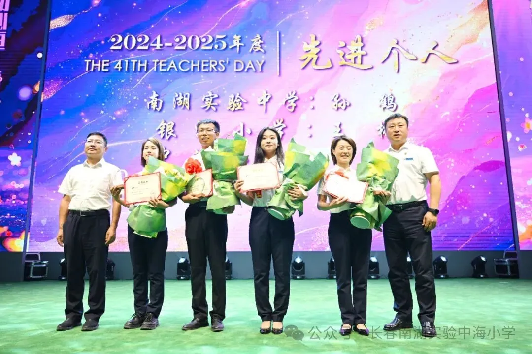 长春南湖实验中学新校园落地净月高新区,得到净月高新区各部门的关心和支持,尤其净月高新区教育局的各位领导一直关注项目进展,不仅多次实地调研、协调解决相关难题,还在政策指导等方面给予全方位支持,全力保障新校址建设顺利推进、搬迁工作平稳落地。这次教师节,净月高新区教育党委书记、局长徐洪兵,副局长王大亮更是亲临颁奖典礼,并为优秀“先进个人”及“先进班集体”颁奖。两位领导亲切慰问获奖代表,勉励全体教师,其深切关怀极大地鼓舞了全体教师坚守初心、奋发作为的热情。