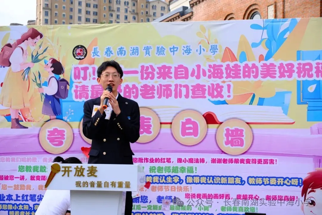 中海毕业生张傲然,如今已经成为中海小学的一名教师。在这个特殊的日子里,他站在曾经熟悉的校园里,望着一张张朝气蓬勃的脸庞,仿佛看到了当年的自己。他精心准备了发言,向曾经教导过自己的老师深深鞠躬,表达着无尽的感恩,也向现在教着学弟学妹们的老师们致以最崇高的敬意,他的话语真诚而温暖,让在场的每一个人都为之动容。