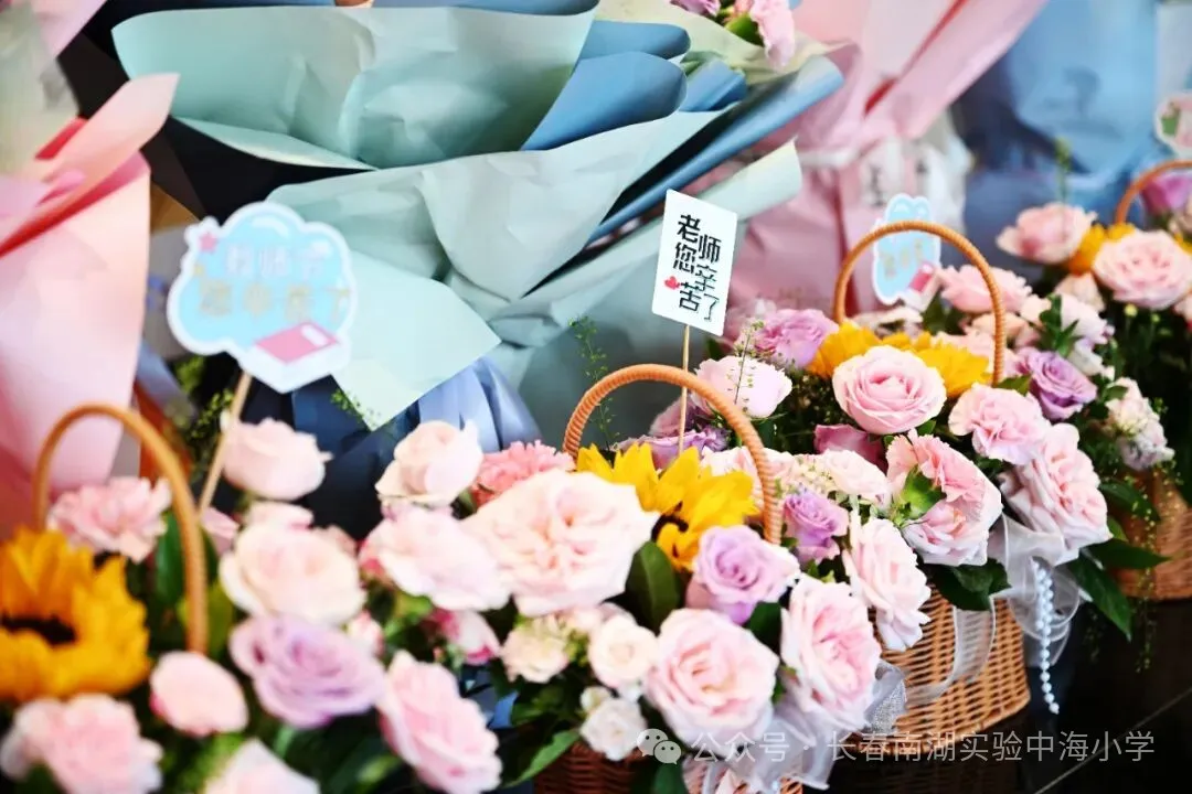 清晨,家长们送来鲜花与锦旗,如同春日里最绚烂的花海,成为了教师节里最动人的风景线。锦旗上的话语熠熠生辉,每一束花、每一面旗都承载着家长们对老师们深深的感激与敬意。