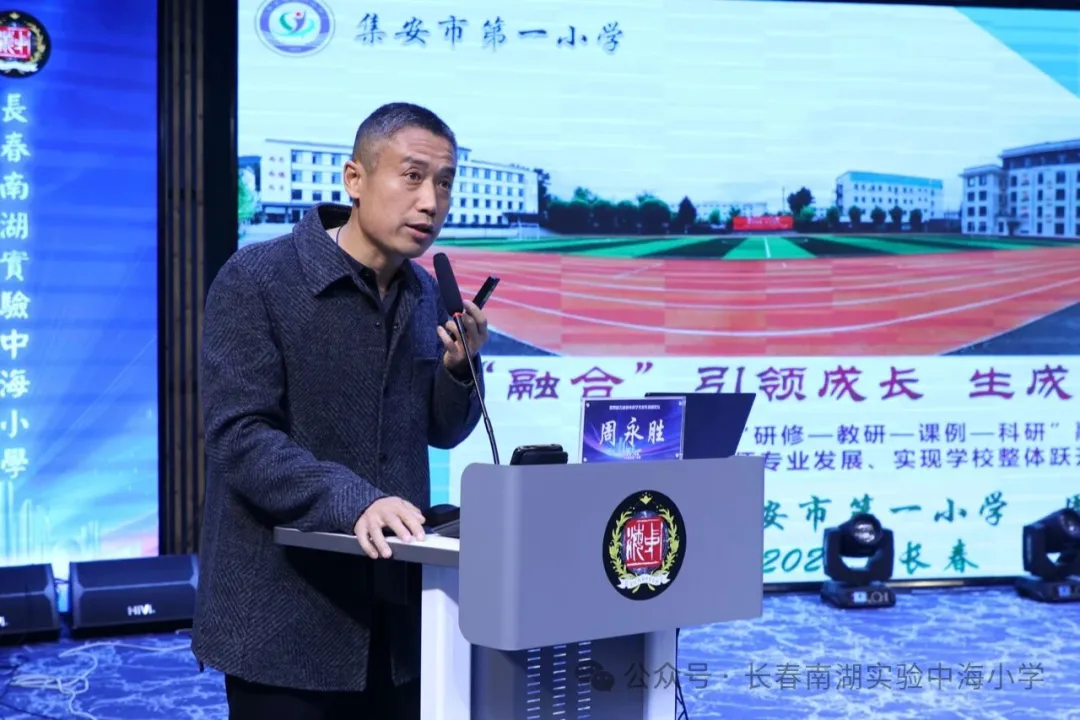 集安市第一小学周永胜校长以《“融合”引领成长,生成质量发展》为题进行汇报,从阐释“教师成长、赋能、高质量发展”概念,实现路径的关键要素和四大行动模式实践尝试三方面内容入手,分析如何统化推进教师专业发展,构建“研修—教研—课例—科研”融合生态,实现学校整体跃升。他还详细介绍了该校以“五维支撑体系”为保障、“四大行动模式”为路径,让教师成长从单点突破走向整体跃升。周校长的分享提供了系统化推进教师专业发展的全新思路。