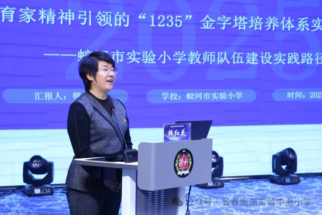 蛟河市实验小学韩红花校长分享了《从“个体优秀”到“群体卓越”,教育家精神引领的“1235”金字塔培养体系实践研究》报告,重点阐述“1235”金字塔体系:锚定一核引领,为师资建设明确方向;强化两翼驱动,双维提升教师素养;实施三阶培养,让不同成长阶段的教师精准补短板;落实五项举措,即通过“精神铸魂、理论领航”等形成协同推动合力,助力教师队伍实现从个人成长到群体卓越的跨越,为学校高质量发展筑牢师资根基。
