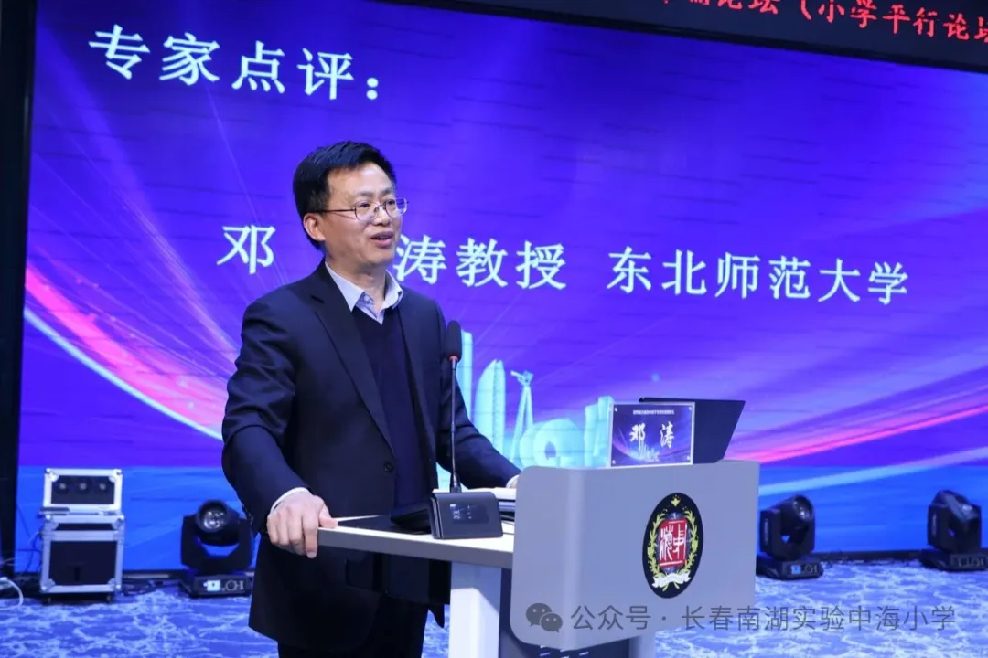 专题报告之后,东北师范大学邓涛教授对两所学校的汇报进行了精彩点评。邓教授首先肯定了我校齐全的课程设置,高度赞誉了教师、学生队伍的高素质。他说:“感谢中海小学为学生们提供一个好的育人环境,‘人人都出彩,人人都多才多艺’,中海小学真正做到按照国家立德树人、全面培养学生的核心素养。”
