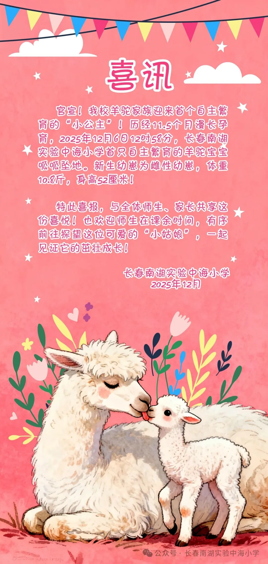 这个“小姑娘”是校园里自带暖意的”新生小欢喜“,更是孩子们亲近生命、体悟成长的鲜活教材。为赋予它专属的温暖印记,也让每一位海娃都能共享这份新生喜悦,学校特发起羊驼宝宝征名活动,诚邀全体师生、家长共同为这只萌宝起个温暖的名字,欢迎大家在公众号下方踊跃留言!