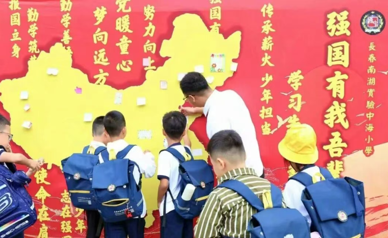 海娃们将自己准备的新学期愿望贴到心愿板上,让家国情怀在他们心中生根发芽。