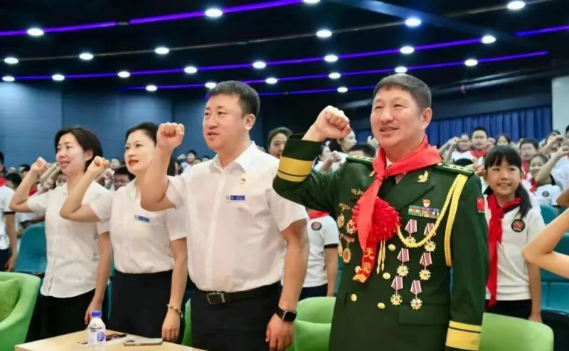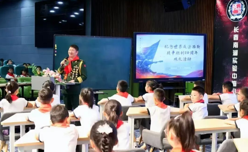 吉林省军休国防教育讲师团团长,长春市关工委火炬宣讲团副团长韩立文同志与学生欢聚一堂,共同观看阅兵仪式,重温烽火岁月,共话家国担当。