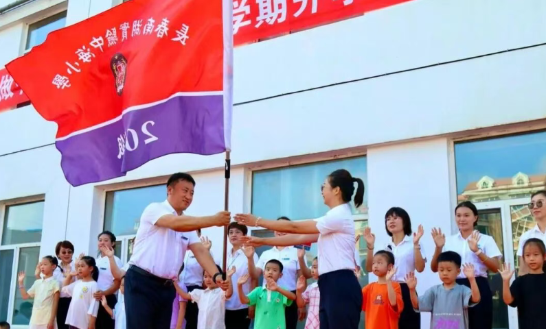 班主任从校领导手中接过班旗,那一面面班旗,象征着团结与荣誉,班旗在微风中轻轻飘扬,引领孩子们,开启崭新的学习旅程。